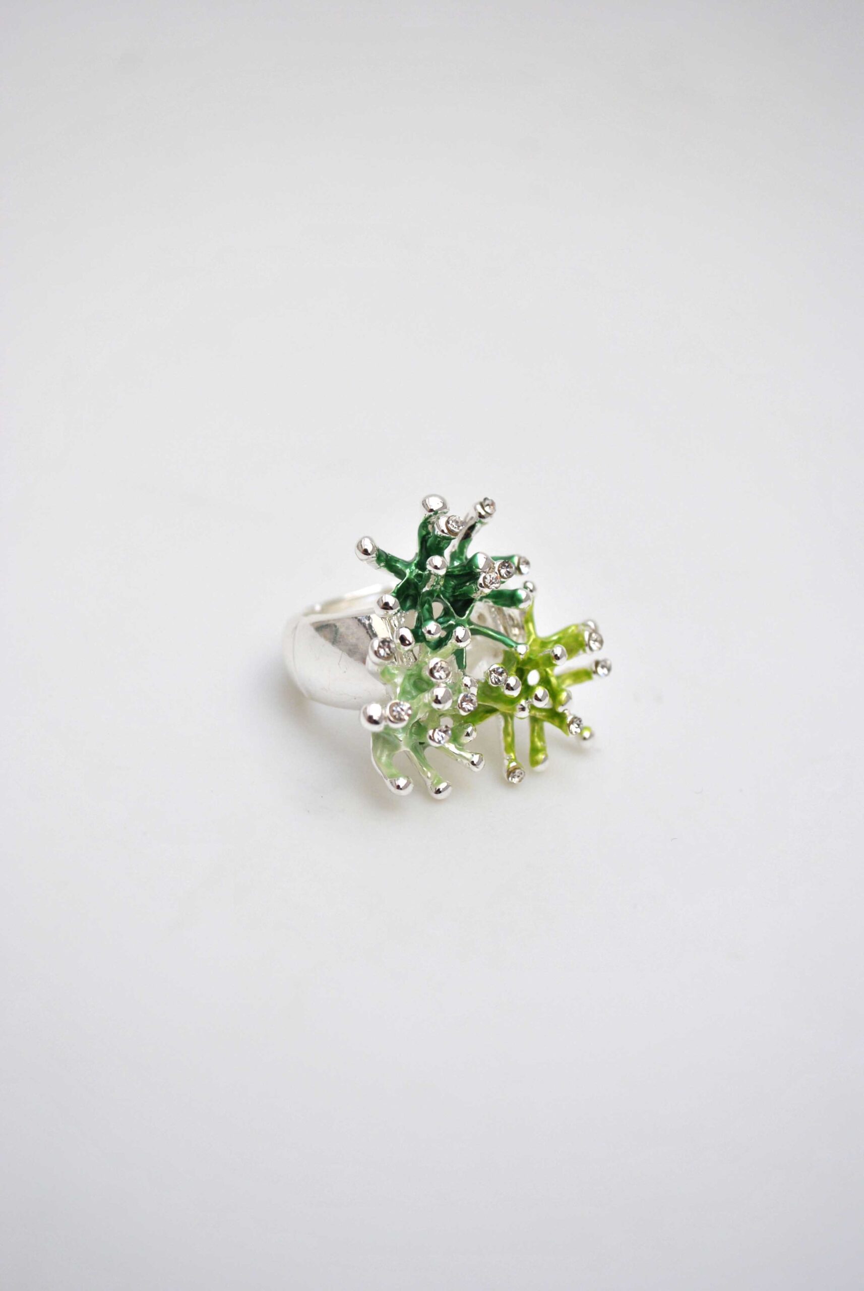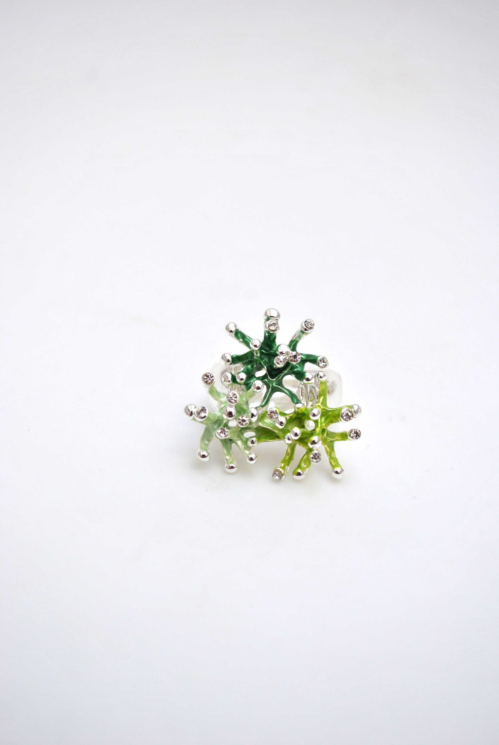 REF: 80150 – Anillo plateado con detalles en esmalte verde en forma de flores tridimensionales, decoradas con pequeñas cuentas plateadas. Una pieza divertida y moderna que aporta un toque fresco y llamativo a tu estilo.
