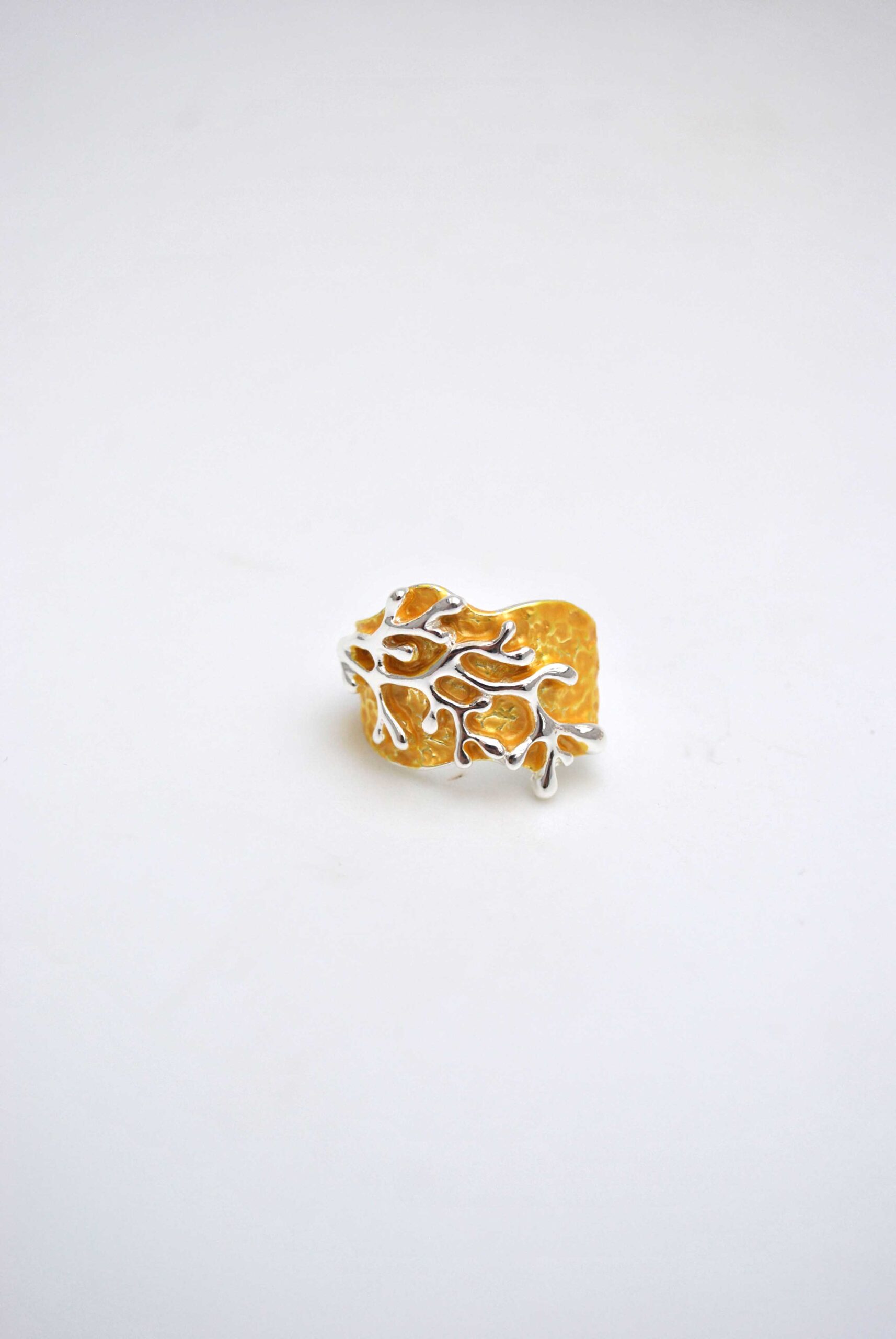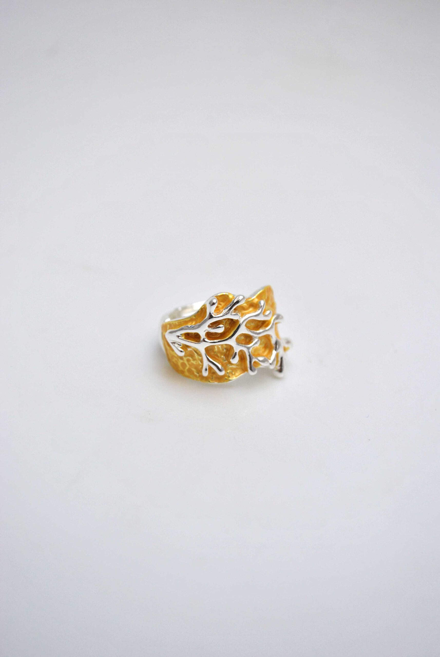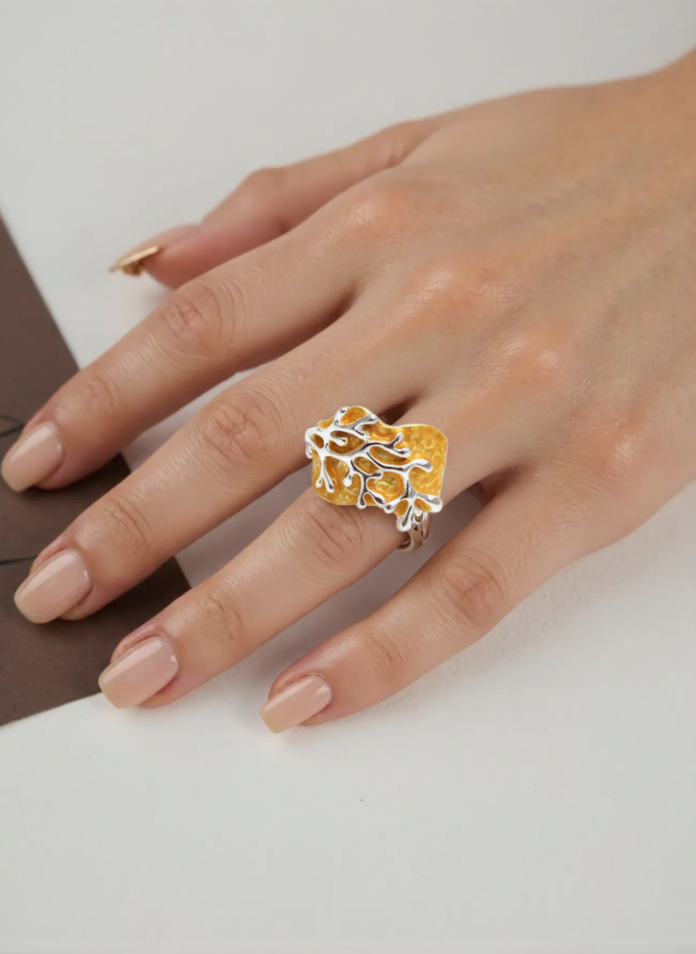 REF: 80150 – Precioso anillo elástico montado en bisutería plateada. Presenta esmaltado en color mostaza y diseño de ramitas plateadas de metal.