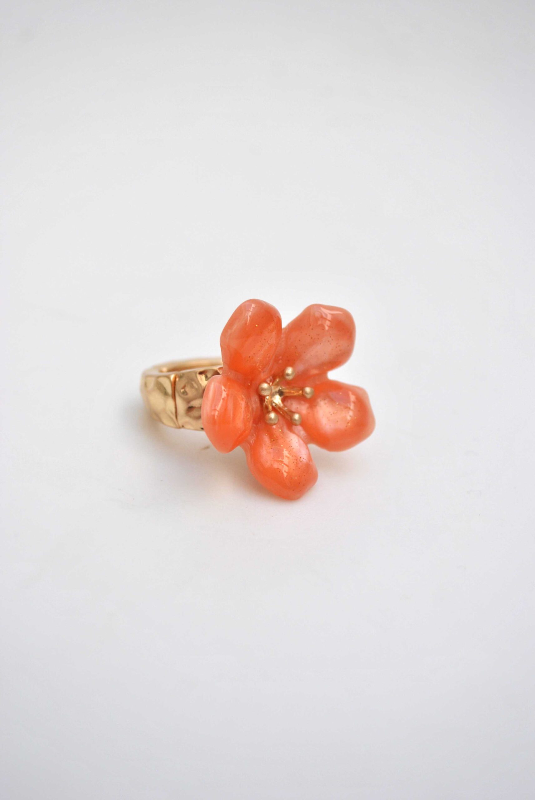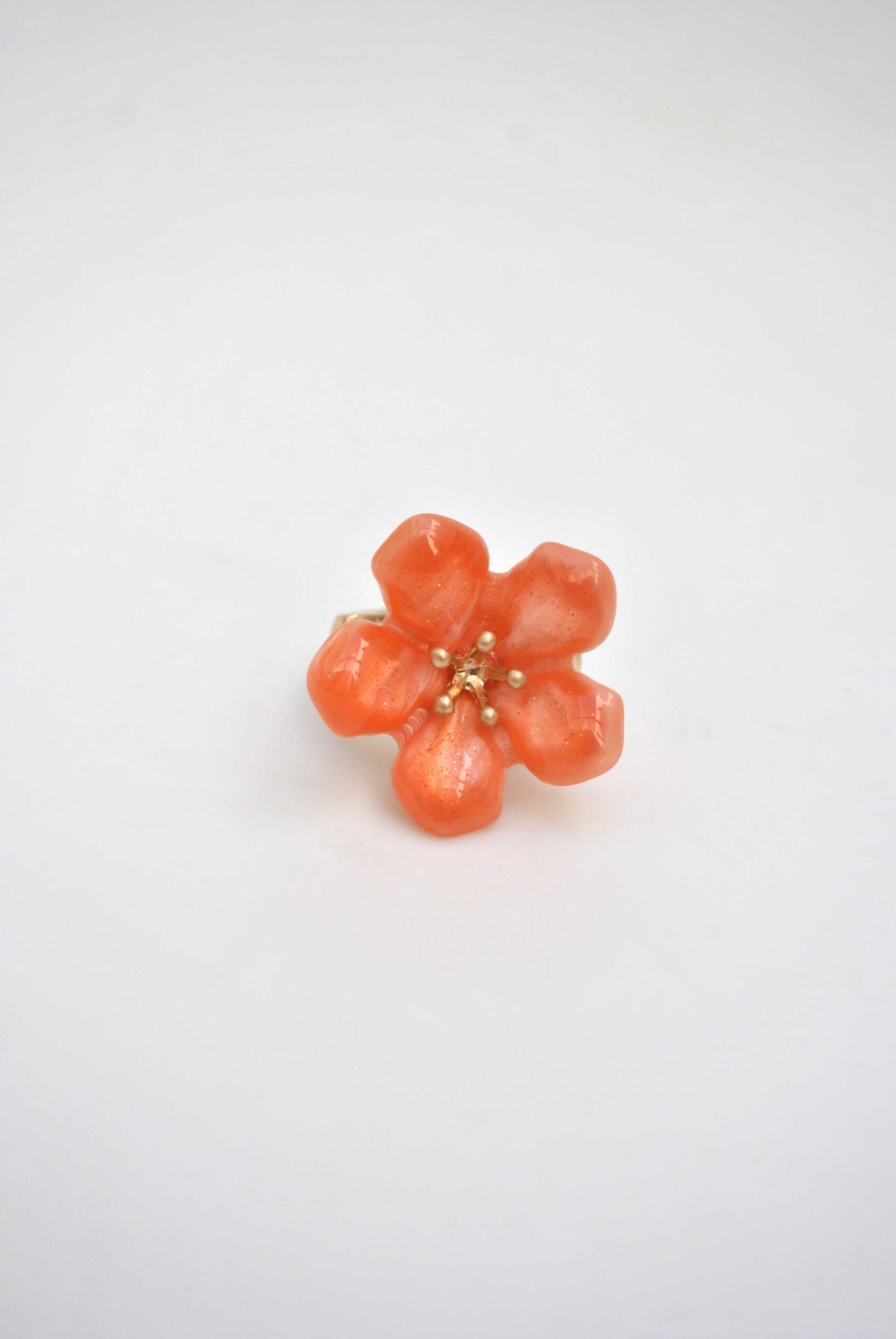 REF: 50351 – Elegante anillo con diseño de flor de cerezo destaca por su delicado acabado en tono naranja perlado. Cada pétalo ha sido meticulosamente elaborado con un efecto nacarado que capta la luz de manera sutil, aportando un brillo suave y sofisticado. El centro dorado de la flor añade un toque refinado y cálido, ideal para complementar tanto atuendos formales como casuales