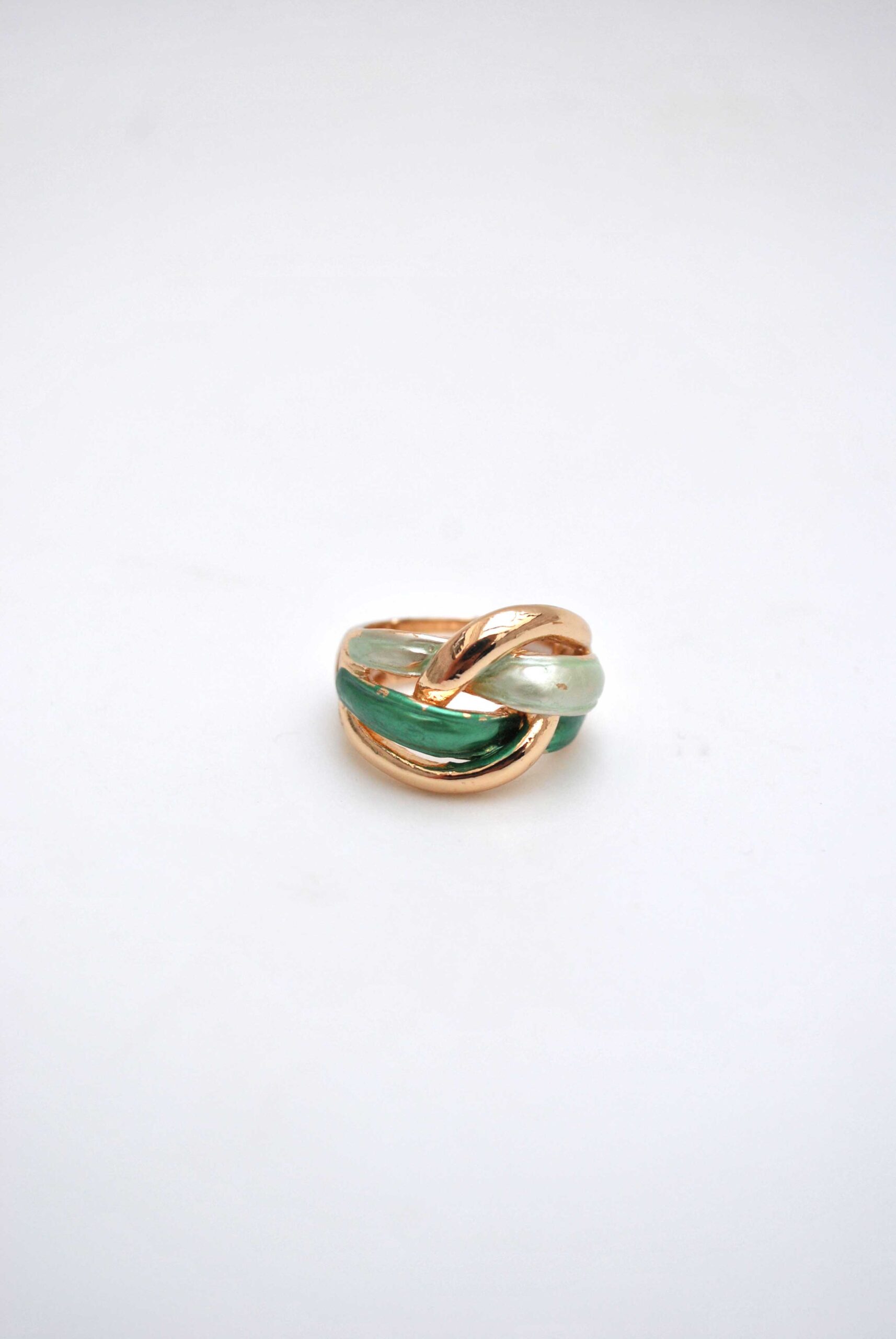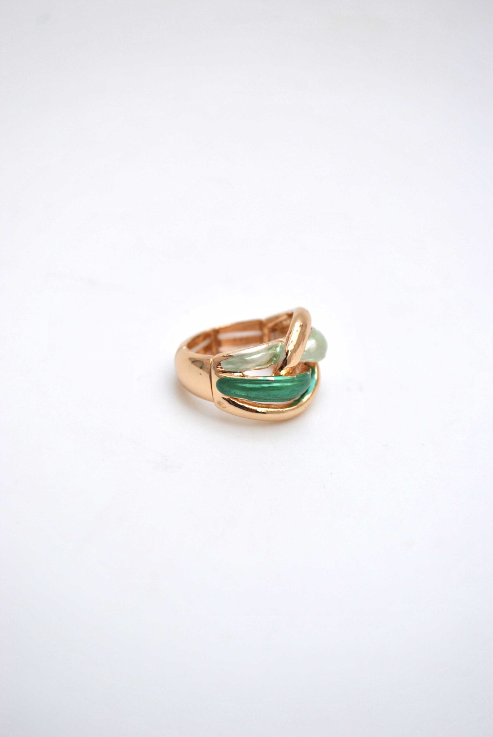 REF: 80150 – Anillo con diseño de nudo trenzado en acabado dorado, decorado con esmalte en tonos verde jade y menta. Una pieza moderna y versátil, ideal para complementar cualquier look con un toque de color y distinción.