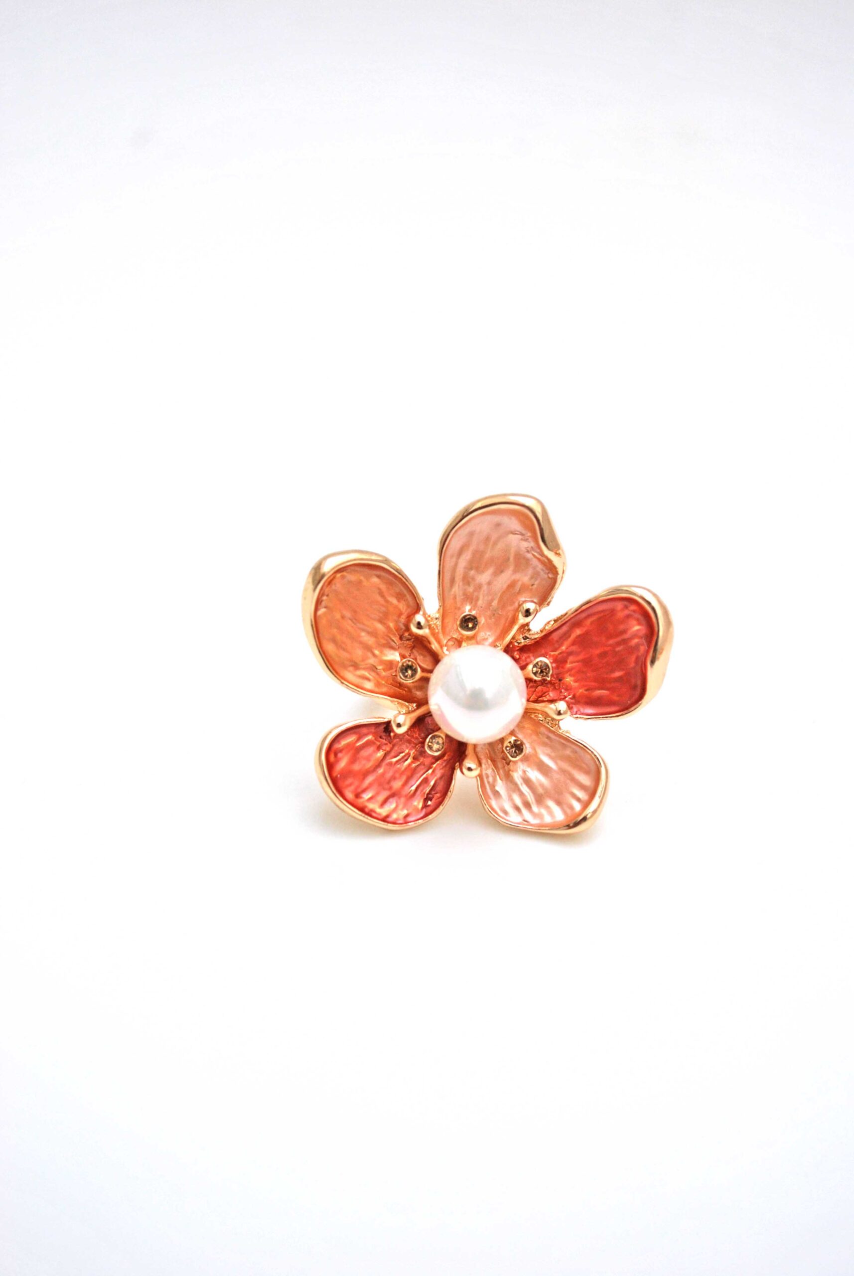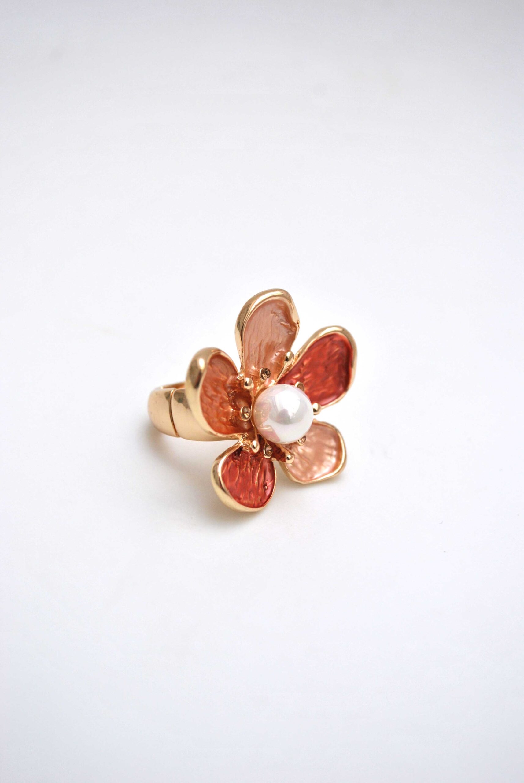 REF: 80150 – Precioso anillo elástico diseñado en forma de flor con pétalos esmaltados en tonos naranjas, montados sobre una base metálica dorada. En el centro, una perla sintética aporta un toque refinado y delicado. Ideal para complementar estilos románticos o dar un acento elegante a cualquier look.