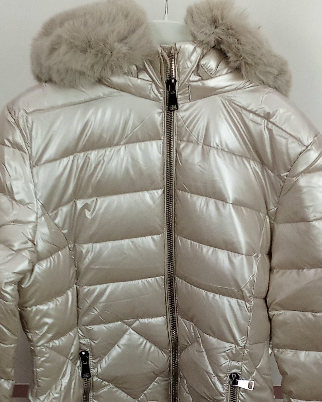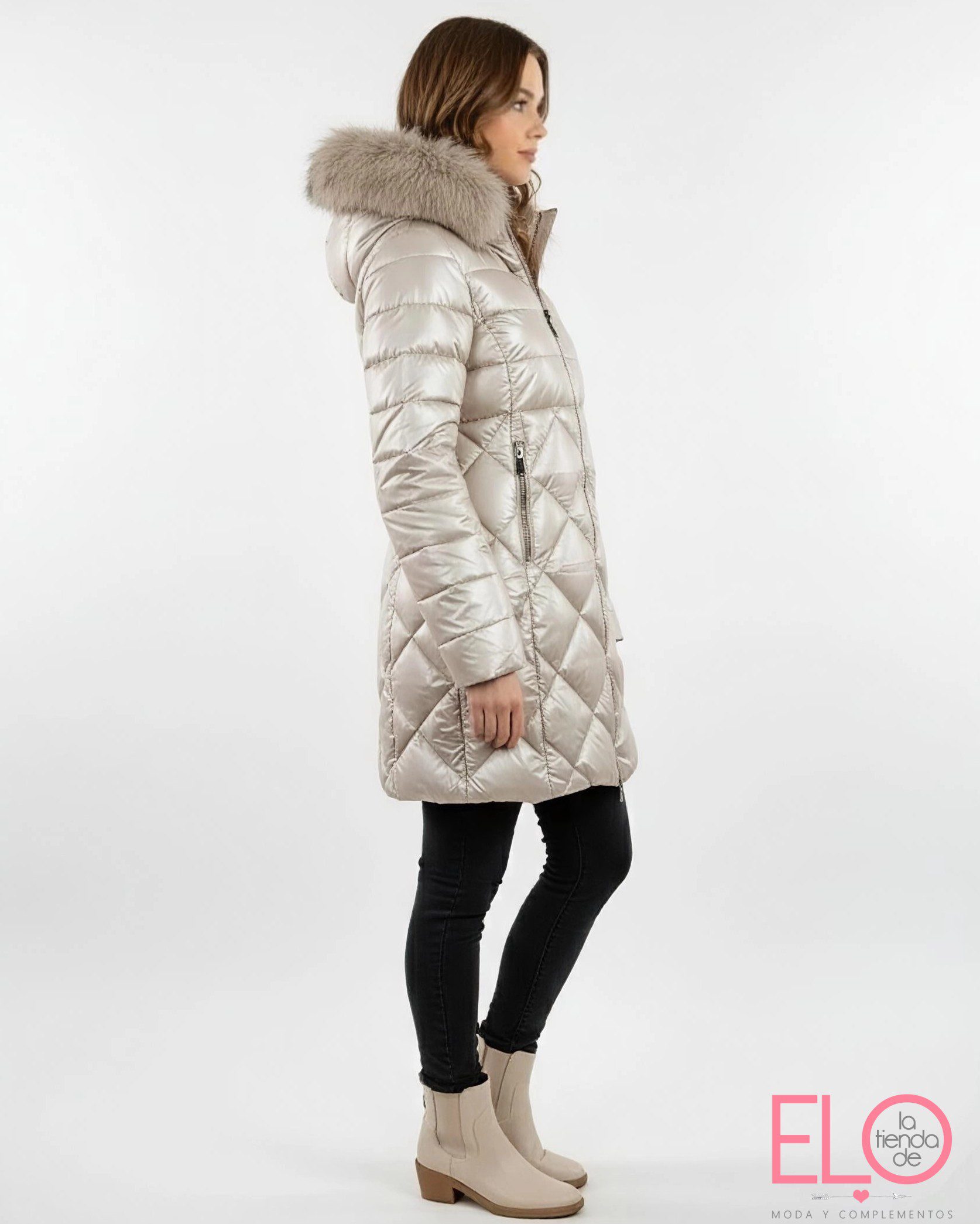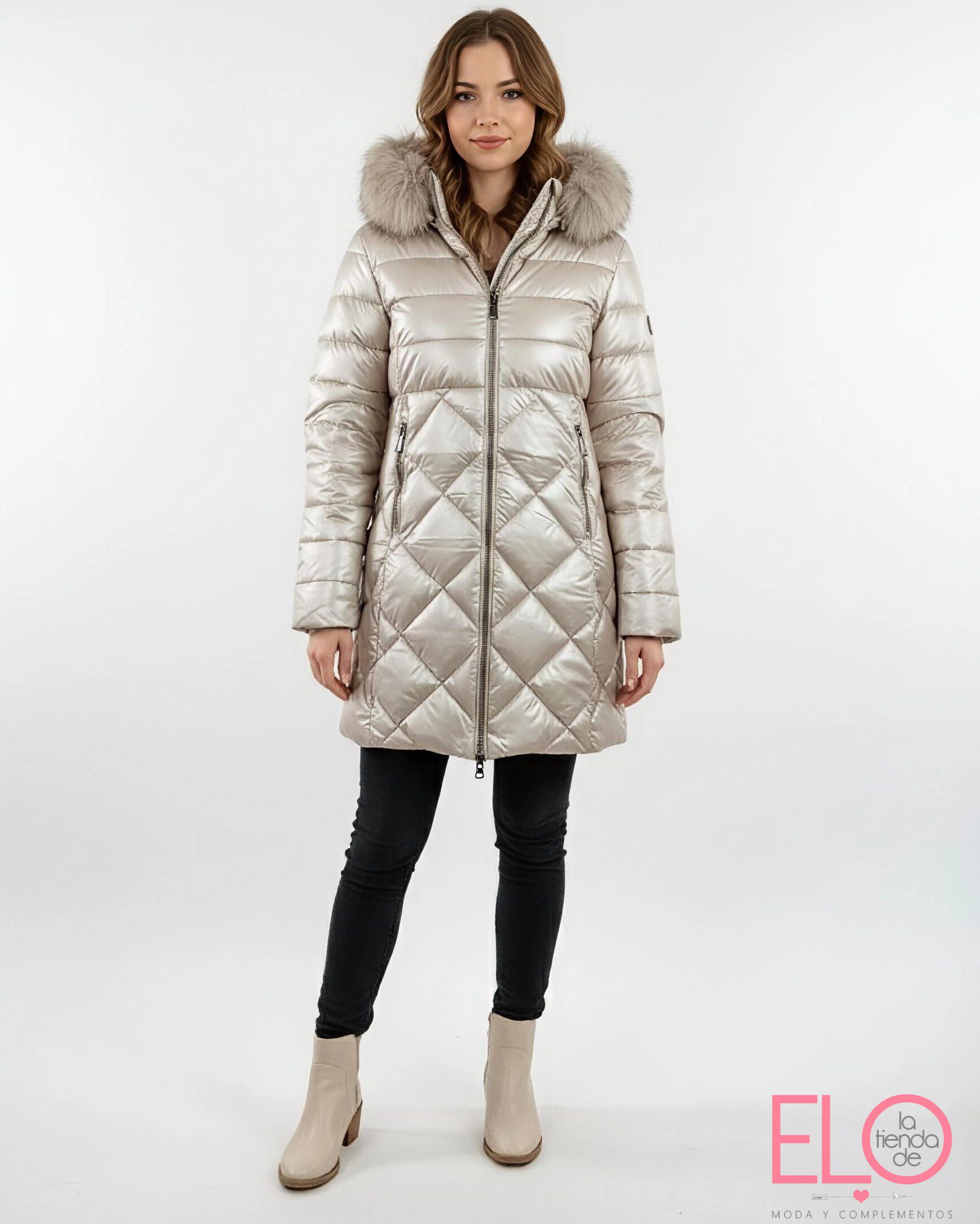 Anorak de corte midi en color champan con efecto brillante.