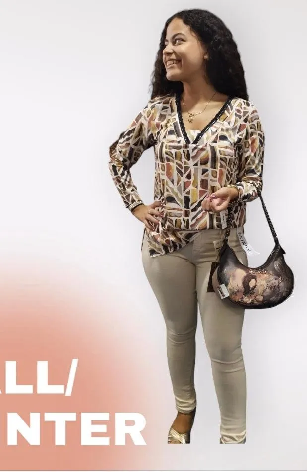 Uno de los detalles que realmente llama la atención es el cuello negro trenzado, que añade un contraste elegante y moderno al diseño general. Este pequeño toque hace que la blusa se vea más refinada y te da la oportunidad de combinarla con una variedad de accesorios y estilos. Los estampados de la blusa, disponibles en diferentes tonos, añaden un toque de frescura y modernidad, haciéndola perfecta para cualquier temporada.