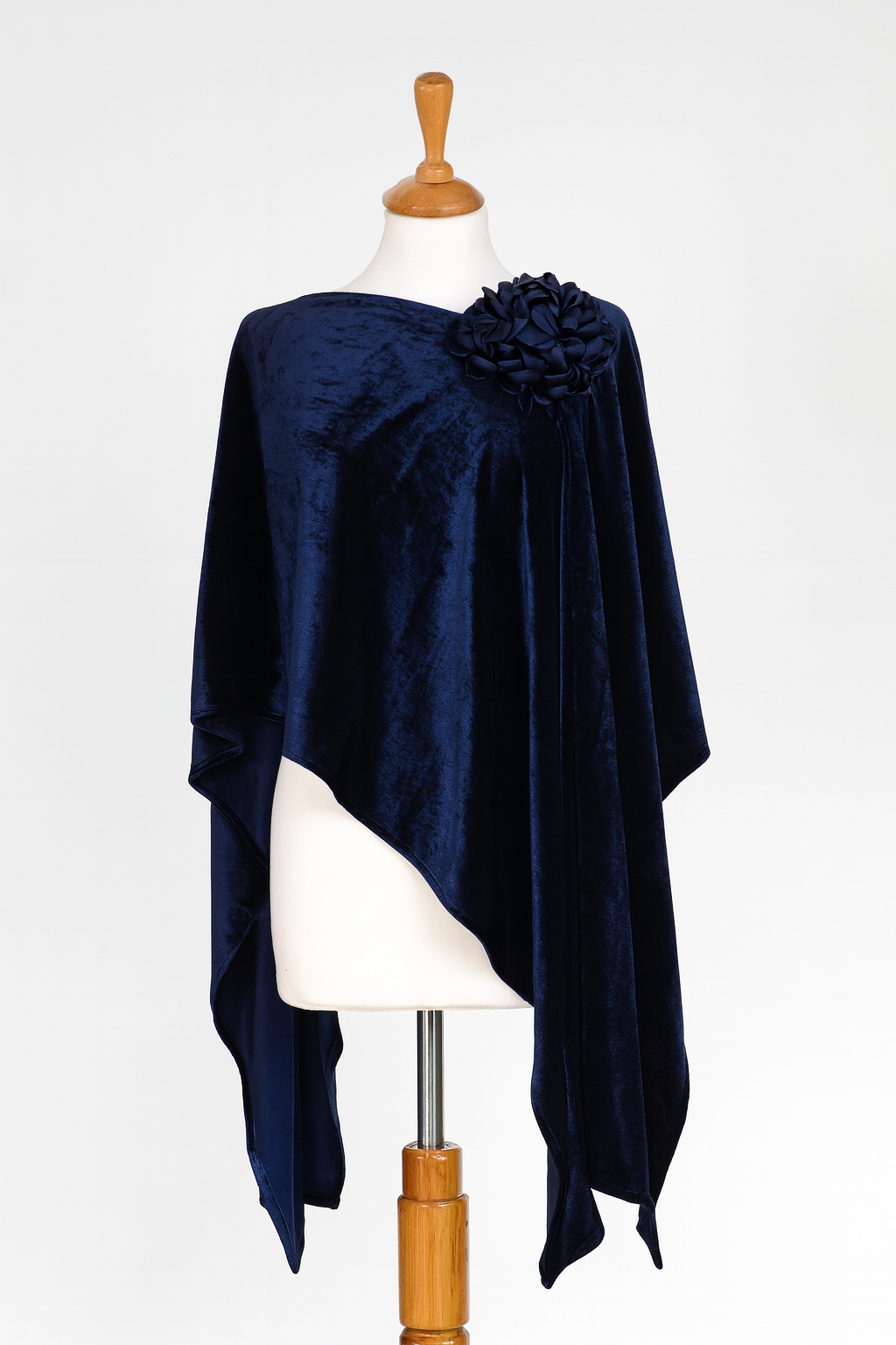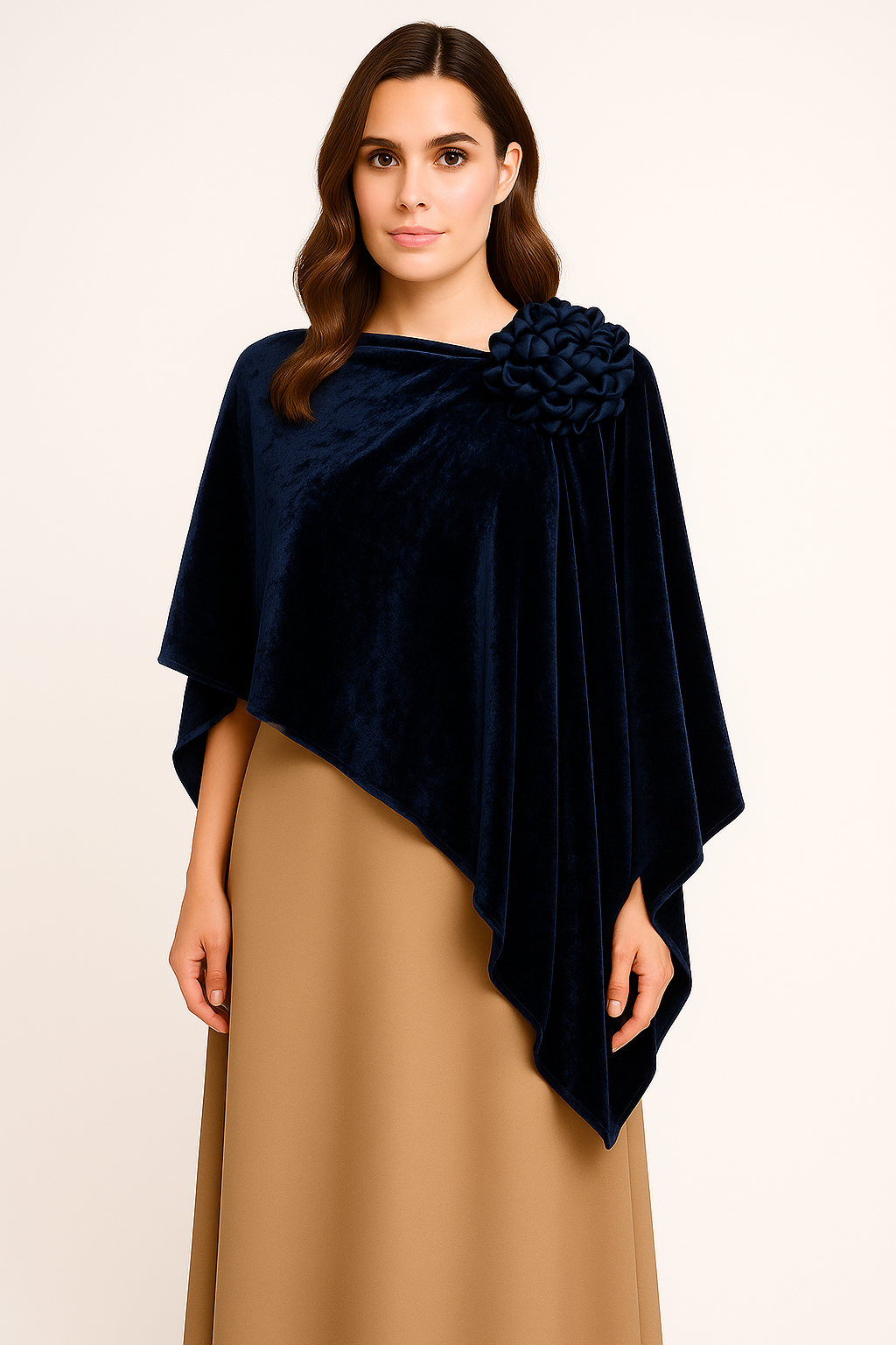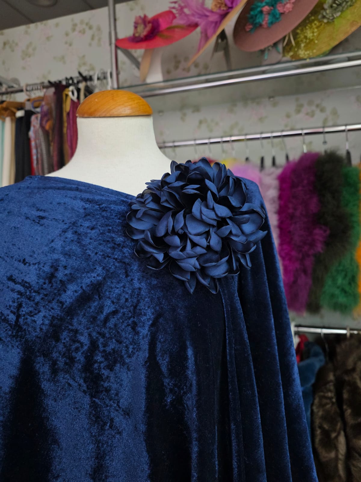 REF: 93357 – Elegante capa de fiesta en color azul marino confeccionada en tela de terciopelo con el detalle de un broche de una flor en el mismo color (se puede quitar), una prenda que combina lujo y comodidad en una sola pieza. Confeccionada con terciopelo de alta calidad, esta capa es perfecta para quienes buscan destacar con un toque de sofisticación.