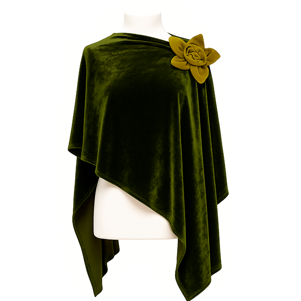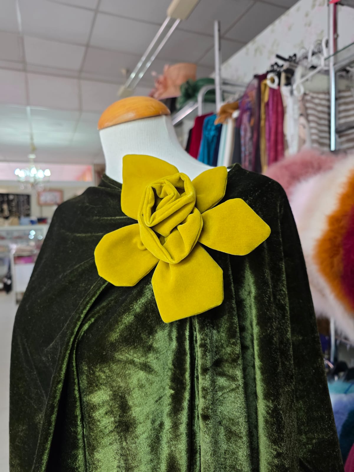 REF: 93357 – Elegante capa de fiesta en color verde oliva confeccionada en tela de terciopelo con el detalle de un broche de una flor en el mismo tejido de color verde más lima (se puede quitar), una prenda que combina lujo y comodidad en una sola pieza. Confeccionada con terciopelo de alta calidad, esta capa es perfecta para quienes buscan destacar con un toque de sofisticación.