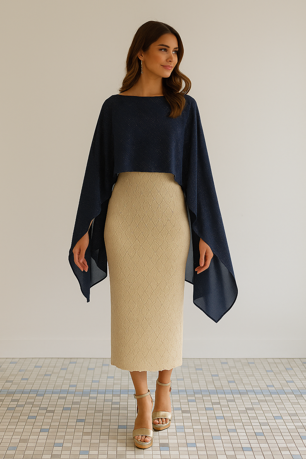 Preciosa capa de gasa multiposición de color azul marino y con tacto seda con hilo en plata que destaca por su diseño exclusivo y alta calidad. Nuestra gasa, un tejido delicado y fluido, añade un toque etéreo y sofisticado a cualquier look de invitada, ceremonias como bodas, fiestas o eventos especiales.