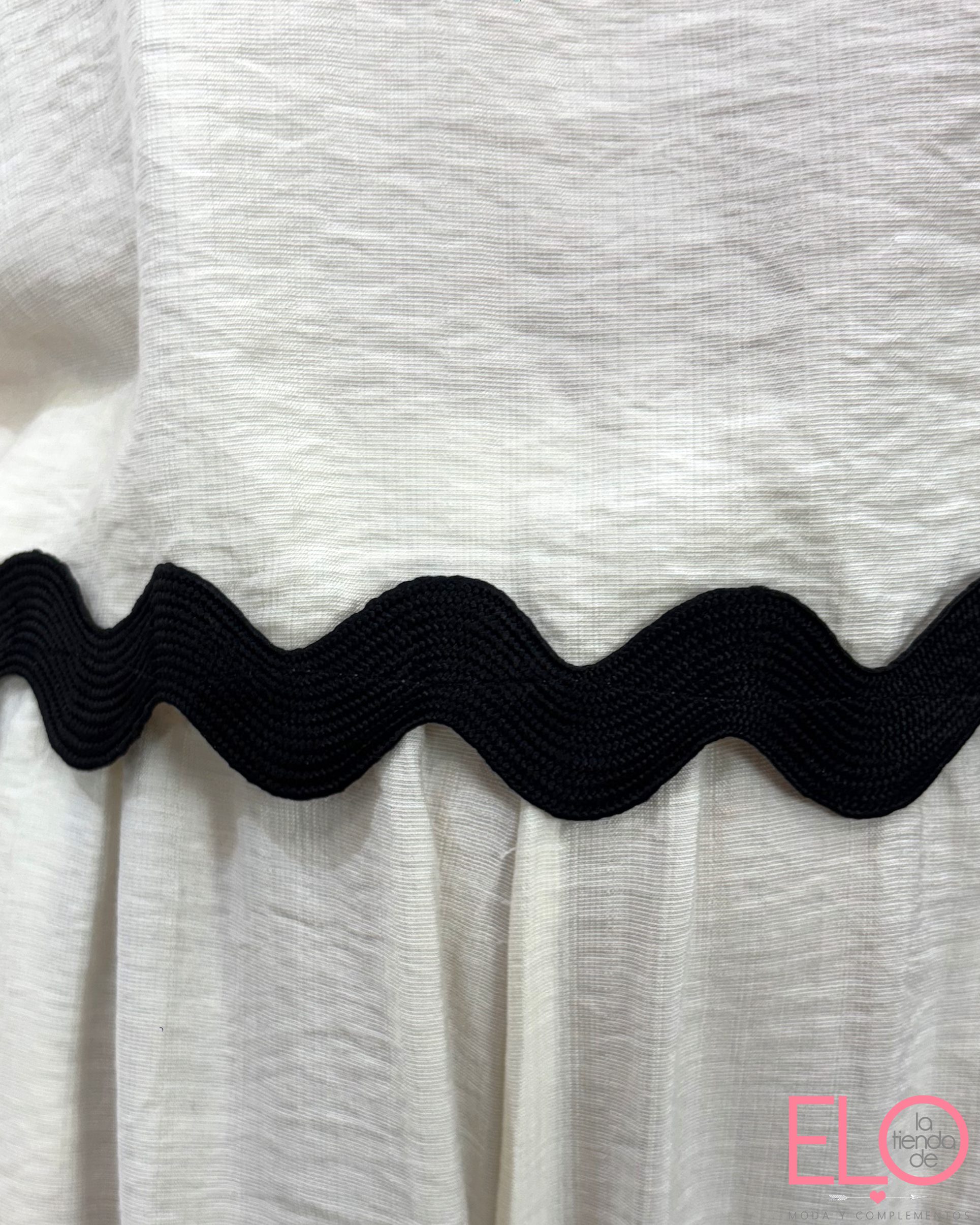 Lleva un una franja en los bordes en forma de olas.