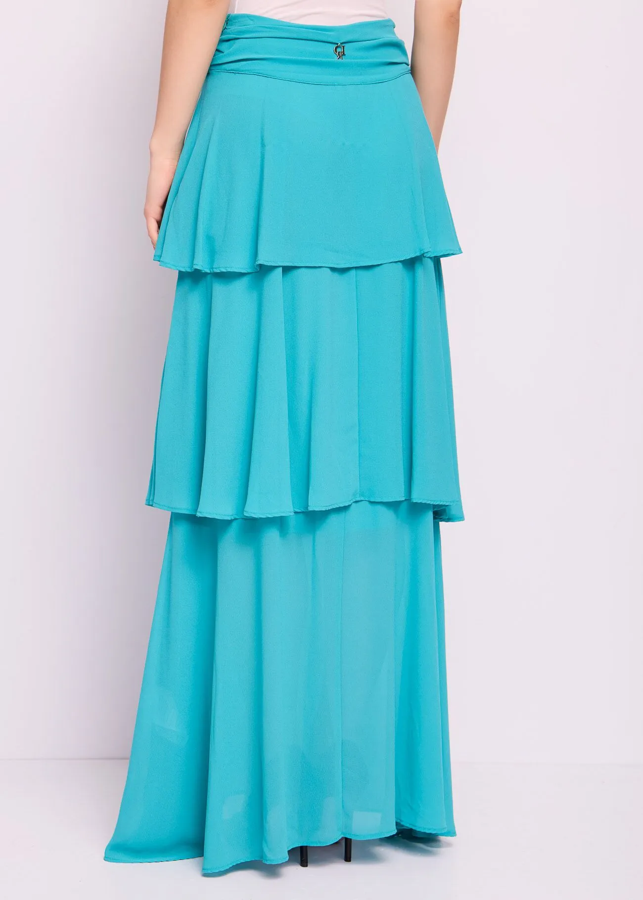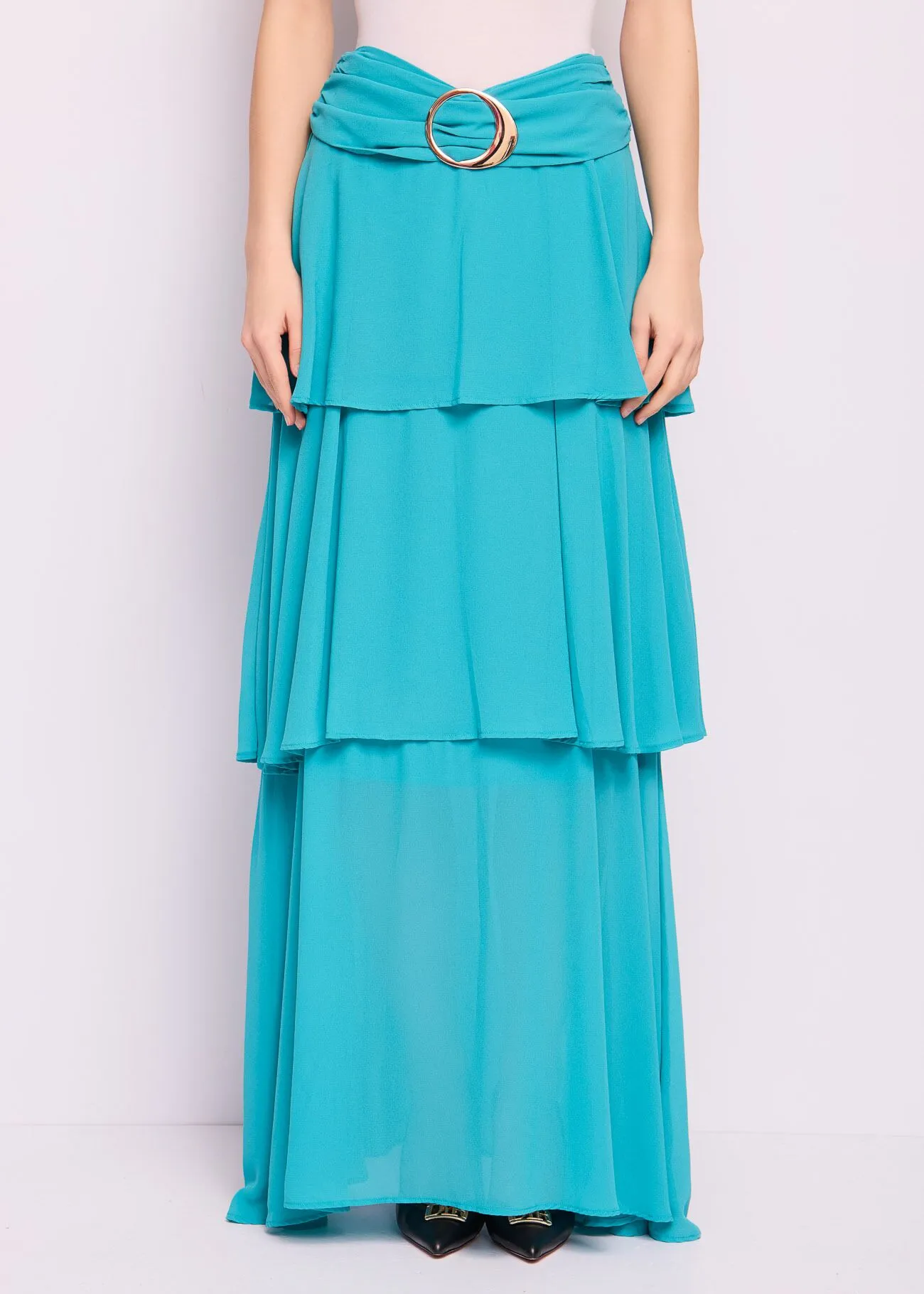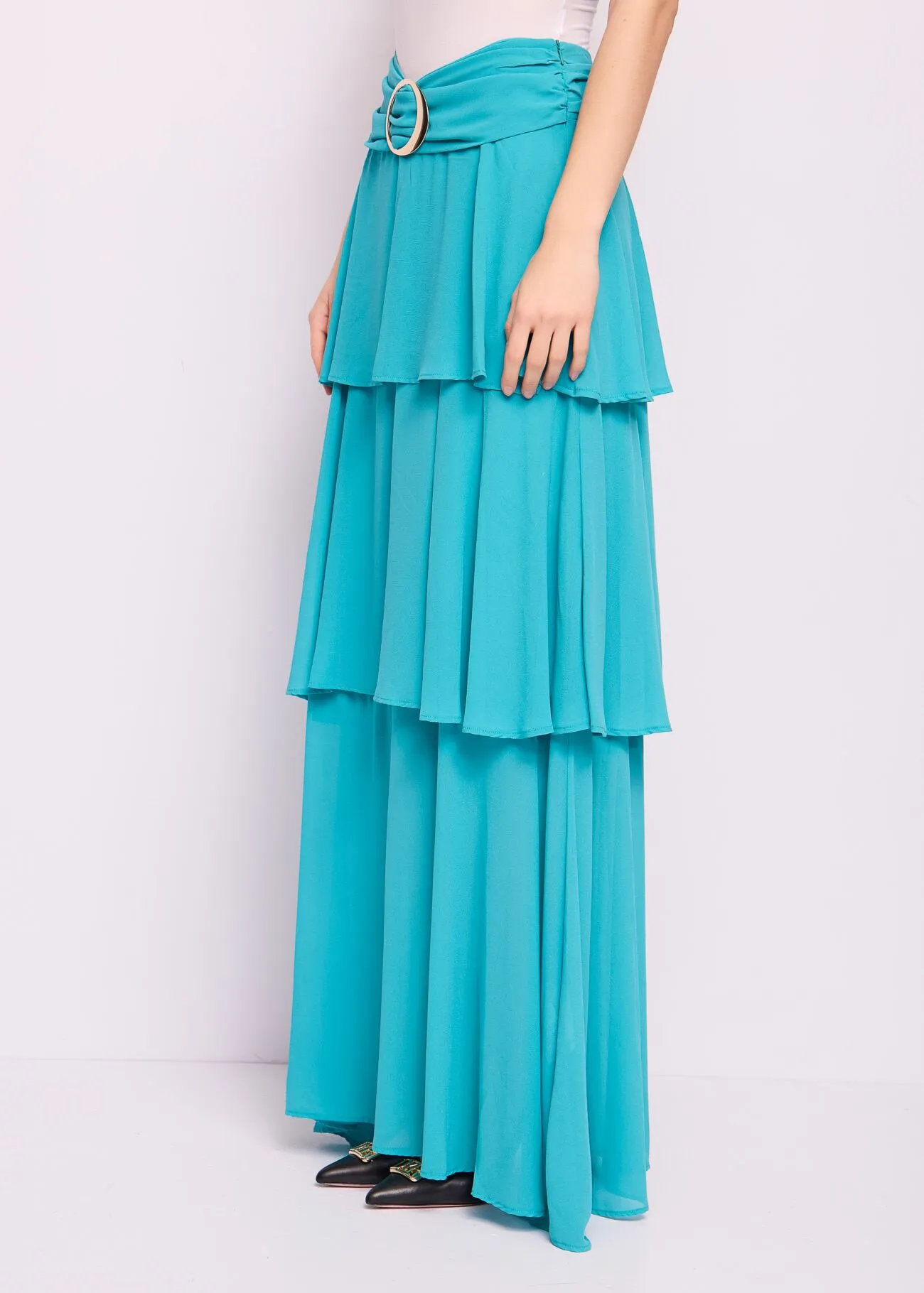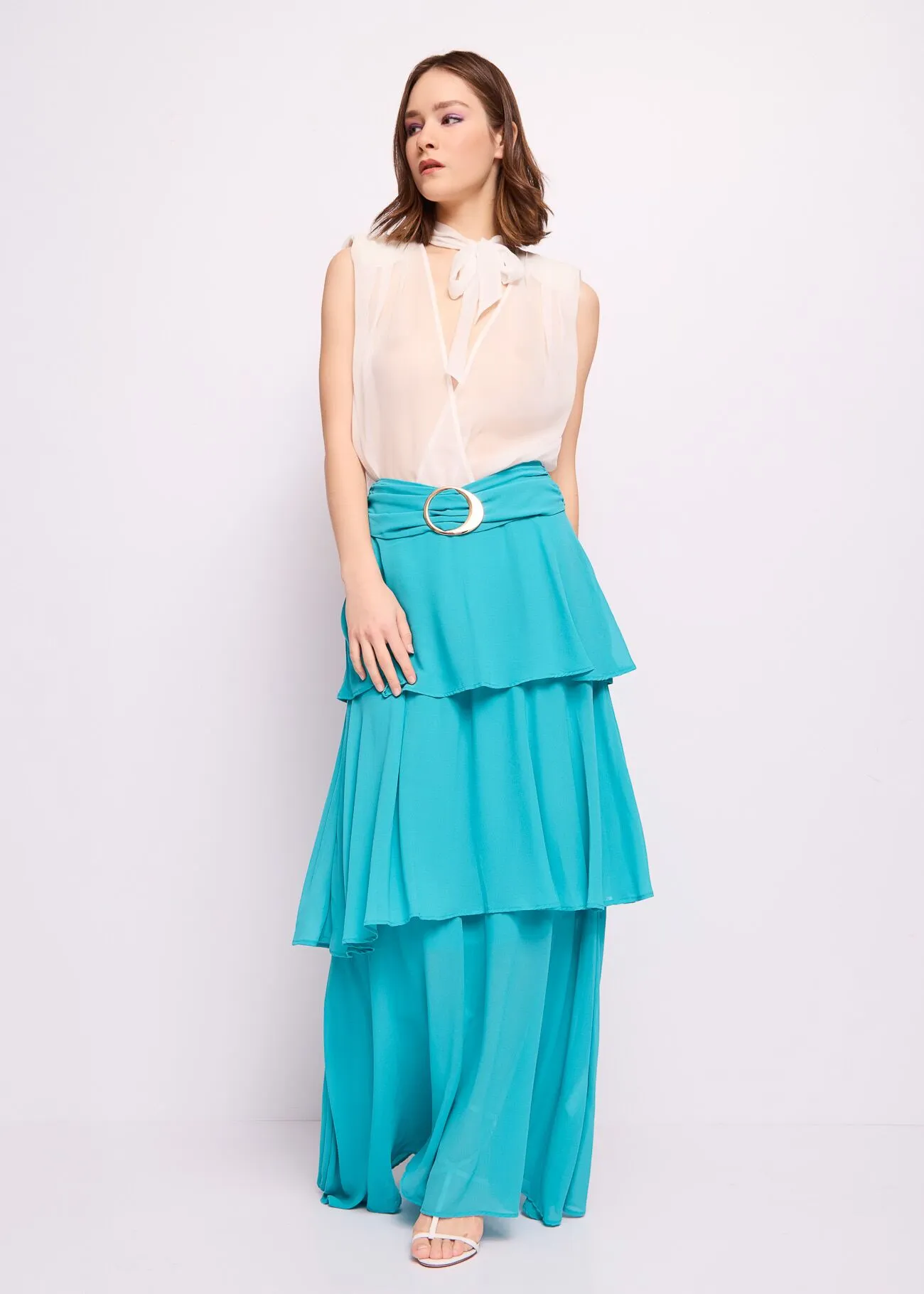 Falda larga con volantes de georgette. Hebilla de metal en la cintura. Charm DR de metal en la parte trasera