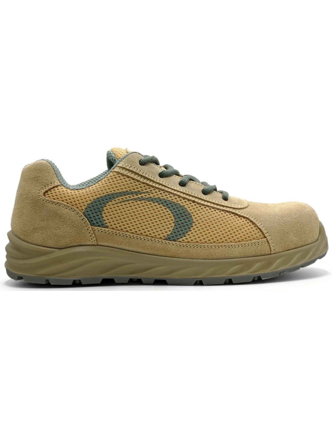 Zapato deportivo de seguridad S1P fabricado en piel serraje color camel y rejilla transpirable.